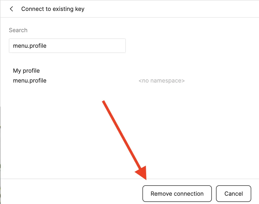 Second, select a key from the list of keys that you want to connect the text to. You can edit the text in the Search field to find any key in Tolgee. After you connect an existing key to the text, the "link" icon will be darker (or lighter when using the Dark theme).